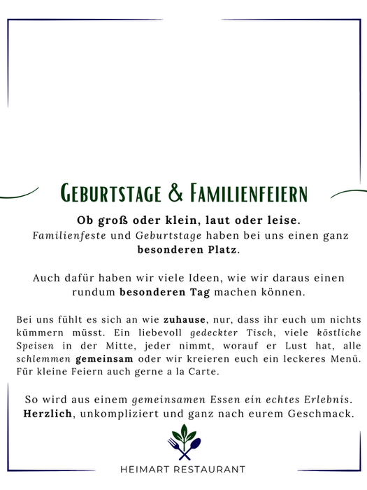 HeimaRt steht für die Verbindung aus Heimat „Heim“ und Kunst „Art“. Es steht für ehrliche Küche, hausgemachte Spezialitäten und Gastfreundschaft, wie wir sie selbst lieben. Wir kochen mit Wurzeln, Herz und Hand. Dabei greifen wir auf traditionelle Rezepte unserer Familien zurück, die wir zeitgemäß interpretieren und mit handgemachten Zutaten aus der Region verfeinern. HeimaRt steht für gutes Essen, bewussten Genuss und echte Begegnungen.